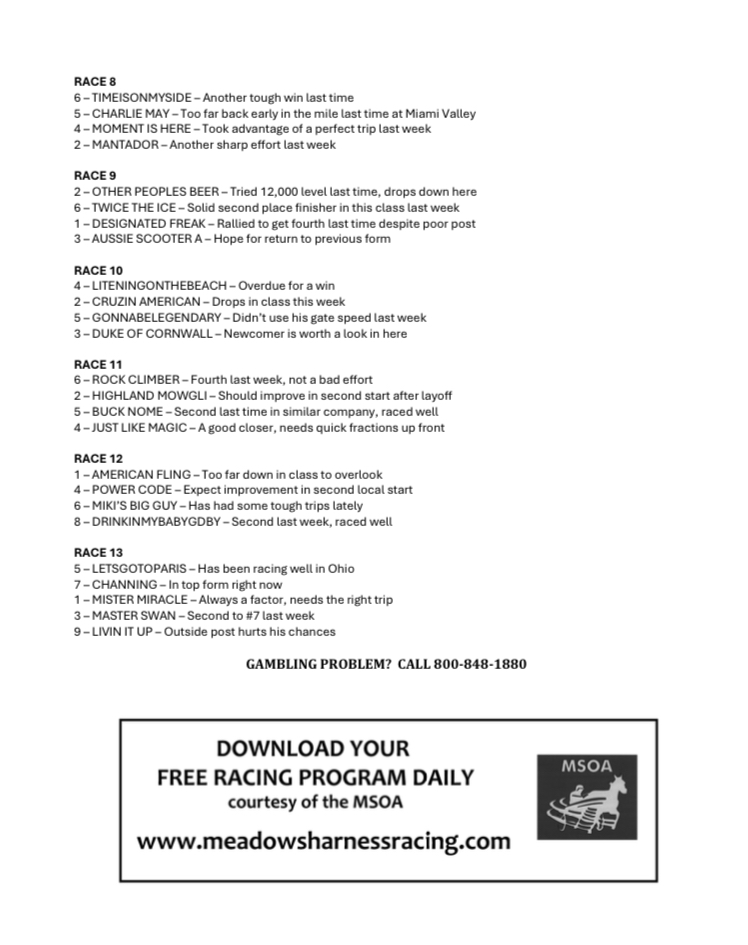 Middle Pick-4: (Races 5-8)1,2/1,5/6,9/6 $8.00 for $1